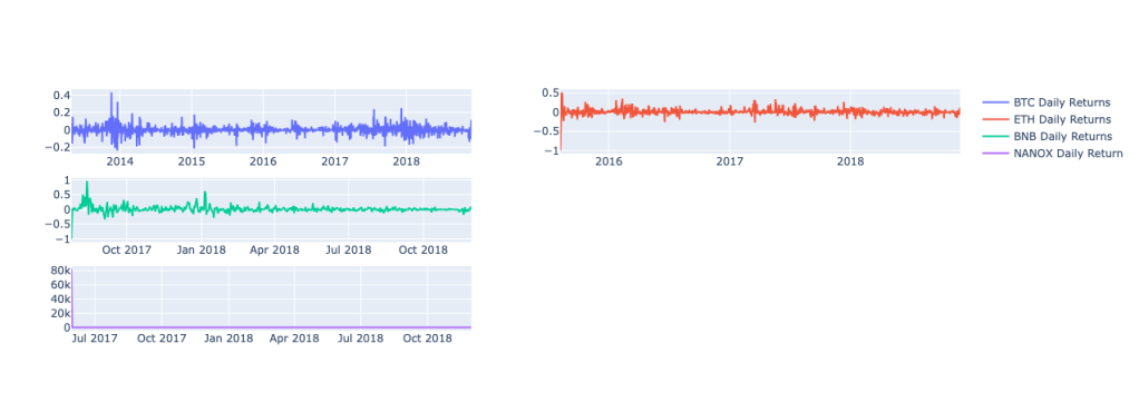 - BTC and ETH showed relatively stable volatility, while BNB and NANOX exhibited more erratic fluctuations due to their shorter trading history.