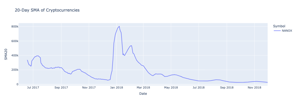 - The price of NANOX exhibited extreme volatility with major spikes, often reaching values far beyond other cryptocurrencies. Due to its large price fluctuations, plotting it together with Bitcoin, Ethereum, and Binance Coin made their trends nearly invisible.