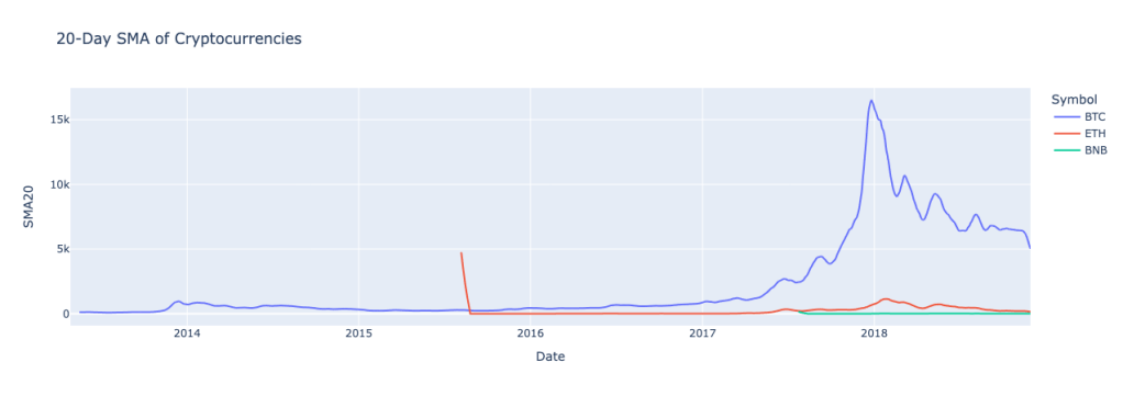 - BTC, ETH, and BNB were grouped in a separate visualization, ensuring their trends and interactions remained visible.
