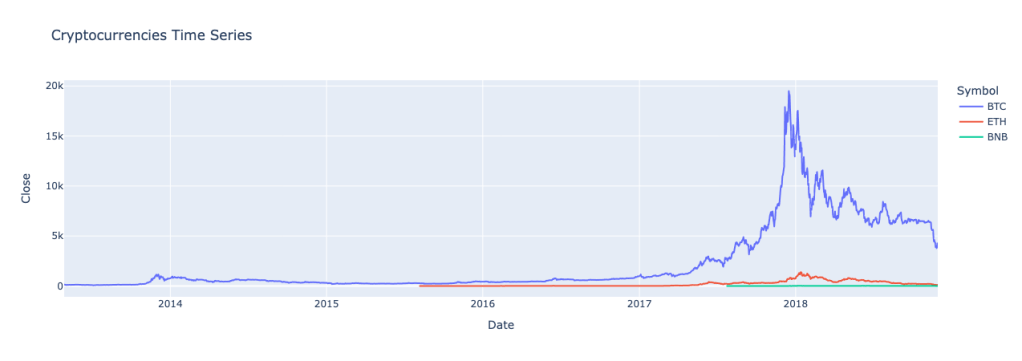 - Bitcoin (BTC) dominates the graph, showing a massive price increase up to $20,000 in late 2017 before experiencing a sharp decline.